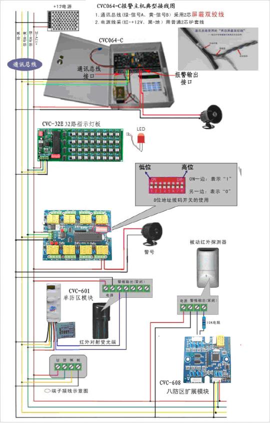 探測器間通過總線接入中控室,中心采用一臺CVC064-C報警主機,該主機可以接64個地址編碼模塊,最大可擴展至512個防區。本次方案設計中,考慮到經濟性,我們采用通過系統控制鍵盤方式進行布、撤防操作,如果系統發生報警,相應防區號碼會在鍵盤的液晶顯示器上顯示出來,并且配有聲光報警,從而,使值班人員快速響應,以最短的時間到達現場。如果用戶需要提高系統的先進性和易操作性,我們可以通過增加管理電腦及相應管理軟件實現,操作者可以方便地通過電子地圖來進行快速布、撤防,和及時、直觀地發現報警地點。另外,報警信息通過繼電器聯動輸出模塊和電視監控系統實現聯動。