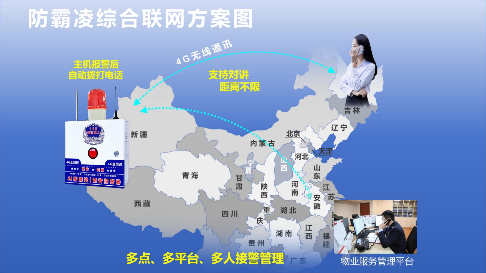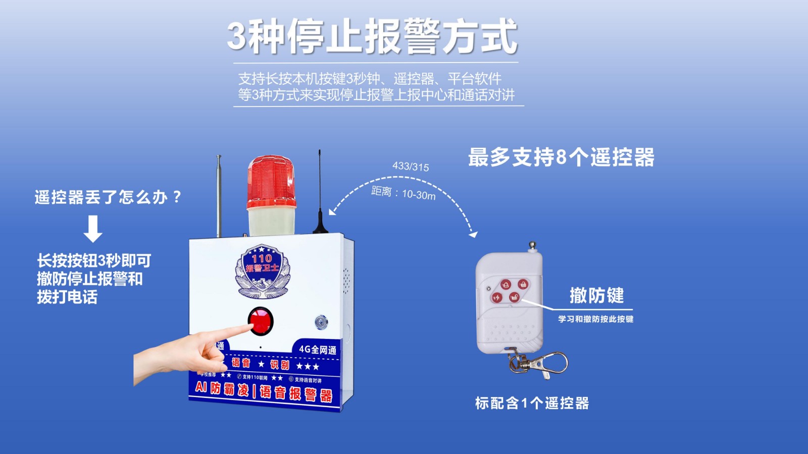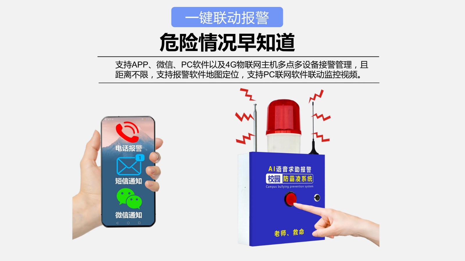 通訊方式:433+4G聯網方式:4G通知方式:電話/微信/PC軟件無線距離: 4G無限模塊類型:CAT1撥號方式:輪播/指定撥