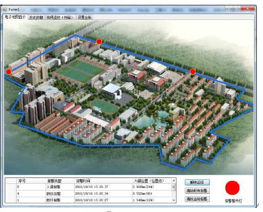 (4)聲光報警、短信發(fā)送、圖像呈現(xiàn):系統(tǒng)發(fā)出聲光報警和地圖點位信息,視頻監(jiān)控系統(tǒng)將事件圖像推送到顯示屏上,并把系統(tǒng)報警信息以短信形式發(fā)送到安防人員手機上。