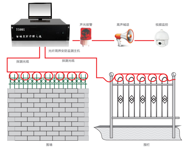 CVC-X6000光纖周界安防系統(tǒng)結(jié)合干涉定位技術(shù)和光頻域掃描技術(shù),通過布設(shè)于設(shè)防區(qū)域的光纖(纜)中的光對觸及或通過承載物(如墻壁、覆土、圍欄等)的環(huán)境應(yīng)力感應(yīng)、分析,將擾動信號傳遞至系統(tǒng)主機,經(jīng)信號提取、波形分析及智能化的行為判別,判斷出不同的干擾類型,如禁行區(qū)域的闖入、翻越圍墻、解纜破壞等,實現(xiàn)系統(tǒng)預(yù)警和告警,并可以聯(lián)動視頻、聲光等設(shè)備,真正實現(xiàn)全方位,全時段的入侵監(jiān)控。