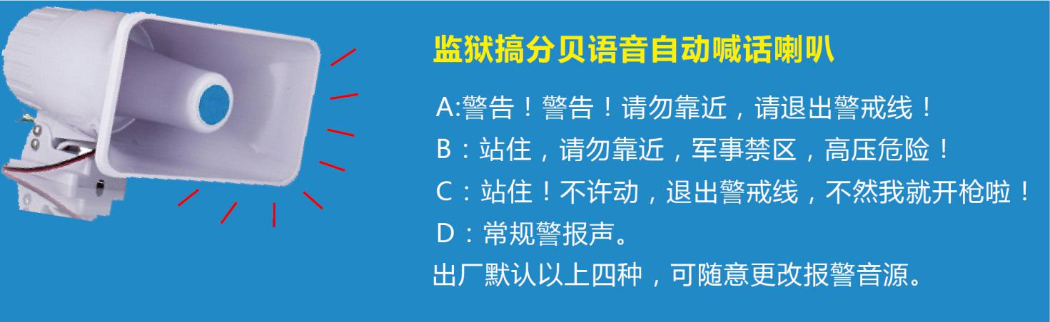 在每個雷達預警機柱子上安裝大功率多功能語音音柱,功率在30W以上,當有可疑人員靠近圍墻時,雷達預警機立刻自動發出“站住!請退出警戒線”的語音警告,能保證至少在100米范圍內起到警告和威懾作用,可以根據監獄的實際要求隨時在現場由監獄管理人員自行更改語音喊話內容。