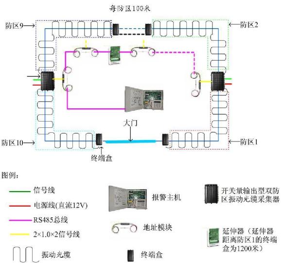 監(jiān)獄本系統(tǒng)主要由四部分組成:報(bào)警主機(jī),開關(guān)量型振動(dòng)光纜采集器,振動(dòng)光纜終端盒,振動(dòng)傳感光纜,末端接續(xù)包。