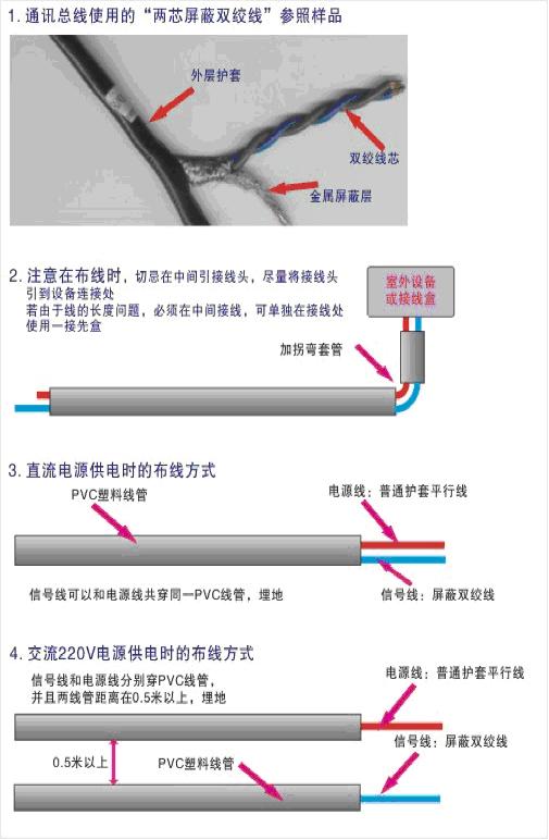 具體要求:銅質(zhì),線徑0.5~0.75平方毫米,阻抗38~88歐姆/公里,容抗30~50納法/公里,絞距20毫米的2芯屏蔽雙絞線(如果線的距離不超過500米,可以適當(dāng)降低線的標(biāo)準(zhǔn),但必須為雙絞線)。