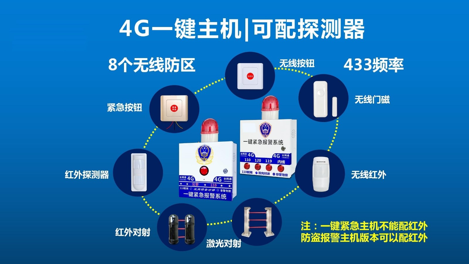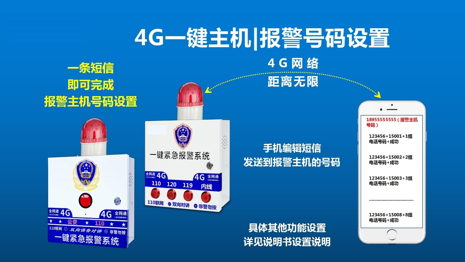 如GSM功能,無線聯網功能等,主機面板自帶一鍵緊急報警按鈕,每個緊急求助報警按鈕的警情可自定義修改,比如可