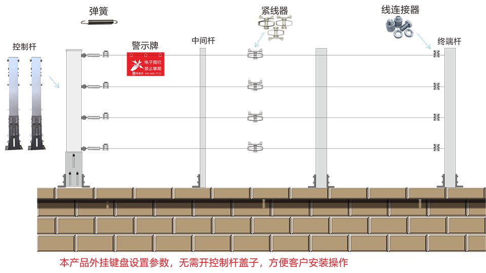適用范圍:四線張力圍欄安裝后,部分圍墻的柱頭與鐵柵欄有小范圍落差造成四線張力式電子圍欄最底下四線鋼絲與鐵柵欄距離大于150mm時,應加裝四線或多道張力圍欄對下面的結構進行補差;能與上面四線張力主機級聯統一在一個防區;